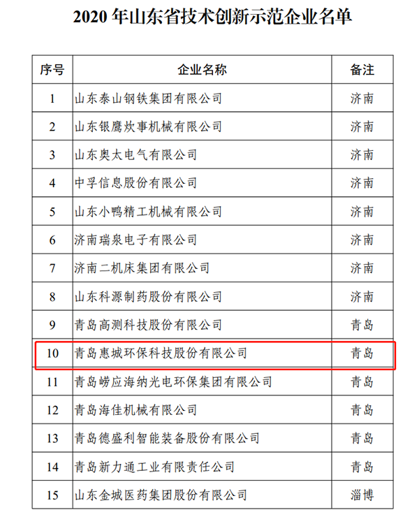 惠城環保榮獲“山東省技術創新示范企業”