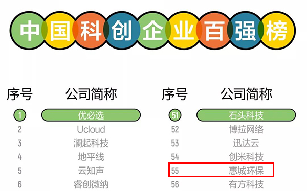 惠城環保榮登中國科創企業百強榜