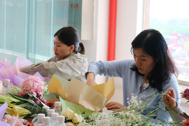 在由玫瑰花、洋桔梗、繡球花、百合、滿天星之香氣調(diào)和而成的陣陣馨香中,花藝師向女職工們講解插花知識(shí),介紹花材的名稱、養(yǎng)護(hù)方案、花材的處理和修剪方法,示范插花步驟,女職工們聚精會(huì)神地學(xué)習(xí)后認(rèn)真設(shè)計(jì)自己的花籃,相互討論,時(shí)不時(shí)迸發(fā)出爽朗的笑聲,經(jīng)過精心設(shè)計(jì),一個(gè)個(gè)形態(tài)飽滿、充滿生命力的花籃就誕生了,大家紛紛拿出手機(jī),記錄下這美好的時(shí)刻。